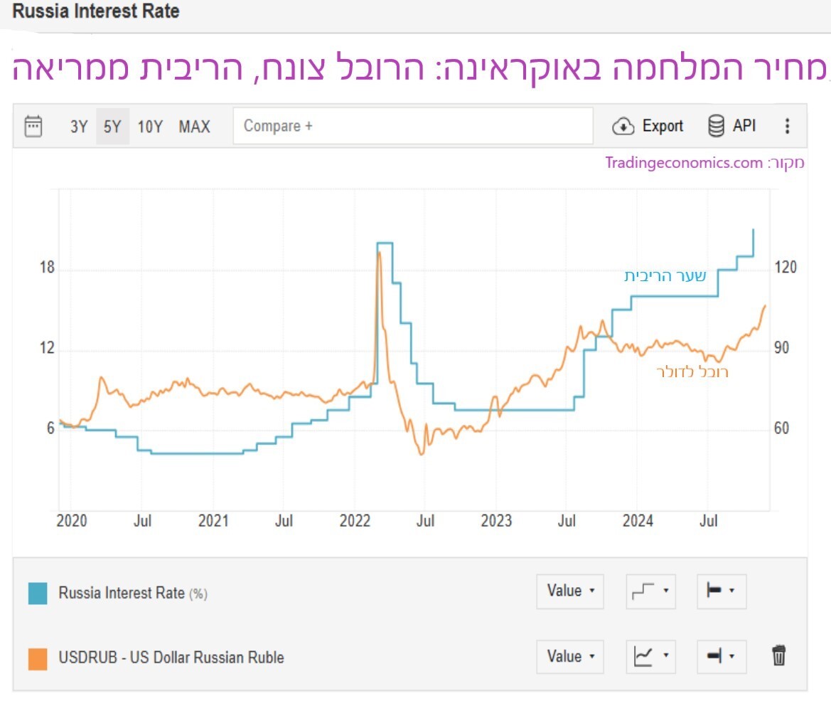 הצלילה של הרובל מייצרת לחצים אינפלציוניים חזקים על כלכלת רוסיה, ומאלצת את הבנק המרכזי של רוסיה להעלות את הריבית. באוקטובר האחרון הועלתה הריבית ברוסיה ל-21%. לפני שנה וחצי עמדה הריבית ברוסיה על 7.5% בלבד. האינפלציה ברוסיה נעה בחודשים האחרונים סביב קצב של 8.5%-9%. יוקר המחיה הוא אחד הגורמים שמייצרים חוסר שקט חברתי ברוסיה, לצד המלחמה שגובה קורבנות רבים ופוגעת גם בכלכלה המקומית. נפילת הרובל קשורה גם לנפילה שנרשמה לאחרונה במחיר הנפט מאחר והמשמעות היא שהכנסותיה של רוסיה מתעשיית האנרגיה הולכות לרדת.