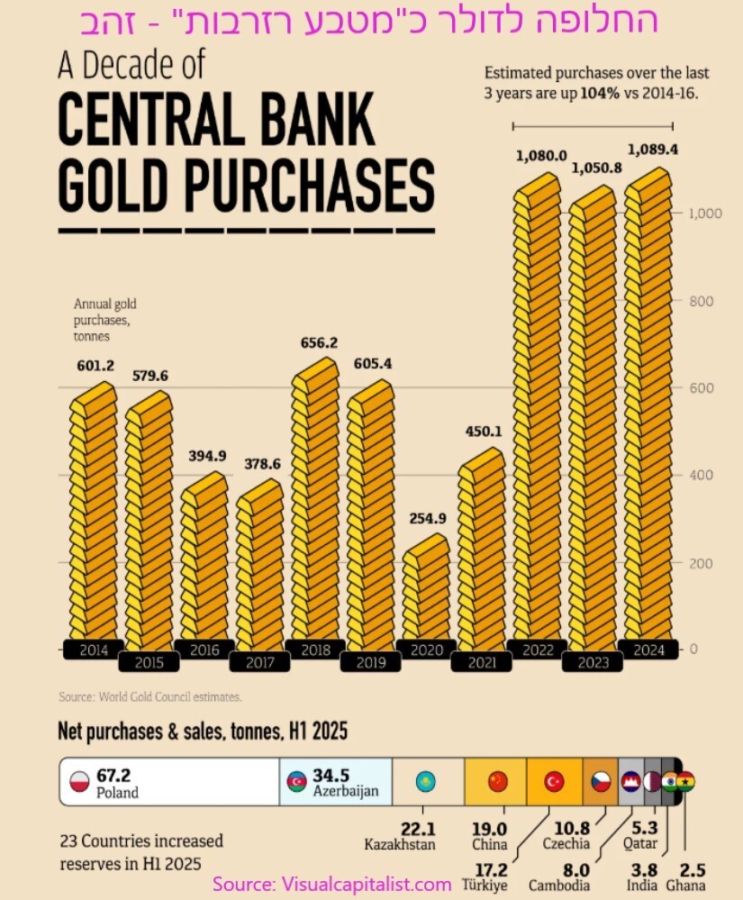 מנתונים באתר visualcapitalist.com עולה כי היקף רכישות הזהב של בנקים מרכזיים צמח מרמה ממוצעת של כ-500 טון בשנים 2014-2021 ליותר ממיליון טון בשנים 2022 – 2024. כלומר קצב הרכישות הוכפל. מבין הרוכשות הגדולות של זהב במחצית הראשונה של 25' ניתן למצוא בעיקר כלכלות מתפתחות כמו פולין (67 טון), אזרביג'אן (34 טון), סין (19 טון) וטורקיה (17 טון).