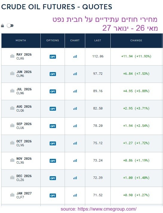 החוזה הקרוב ביותר, זה שיפקע במאי 26', הוא כרגע גם היקר ביותר. המחיר שננקב בו עומד על כ-112 דולר לחבית. לעומת זאת, בחוזה שיפקע בינואר 27' מחיר הנפט עומד על כ-71.5 דולר בלבד.