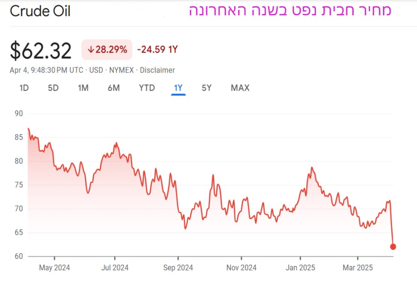ביום ו', בעקבות מכסי הגומלין שהטילה סין על ארה"ב צלל מחיר הנפט ב-7% ונסגר במחיר של כ-62 דולר – שפל של יותר משלוש שנים. הנפט השלים בכך צניחה של 13% מתחילת אפריל, ו-28% בשנה האחרונה.