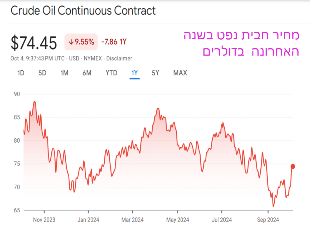 ההתפתחות המלחמתית האחרונה מגיעה בתקופה שבה היצע הנפט בעולם גבוה, גם בשל היחלשות הביקושים מסין. גם לאחר הקפיצה של השבוע, מחיר הנפט עדיין נמוך משמעותית ממחירו לאחר השבעה באוקטובר. שבועיים לאחר הטבח נגע הנפט במחיר של 88 דולר. זה גם היה מחיר השיא שלו ב-12 החודשים האחרונים. בין אוקטובר 23' לספטמבר 24' צלל מחיר החבית בכ-25%. כעת המגמה עלולה להשתנות, ולהשפיע גם על לחצי האינפלציה בעולם.