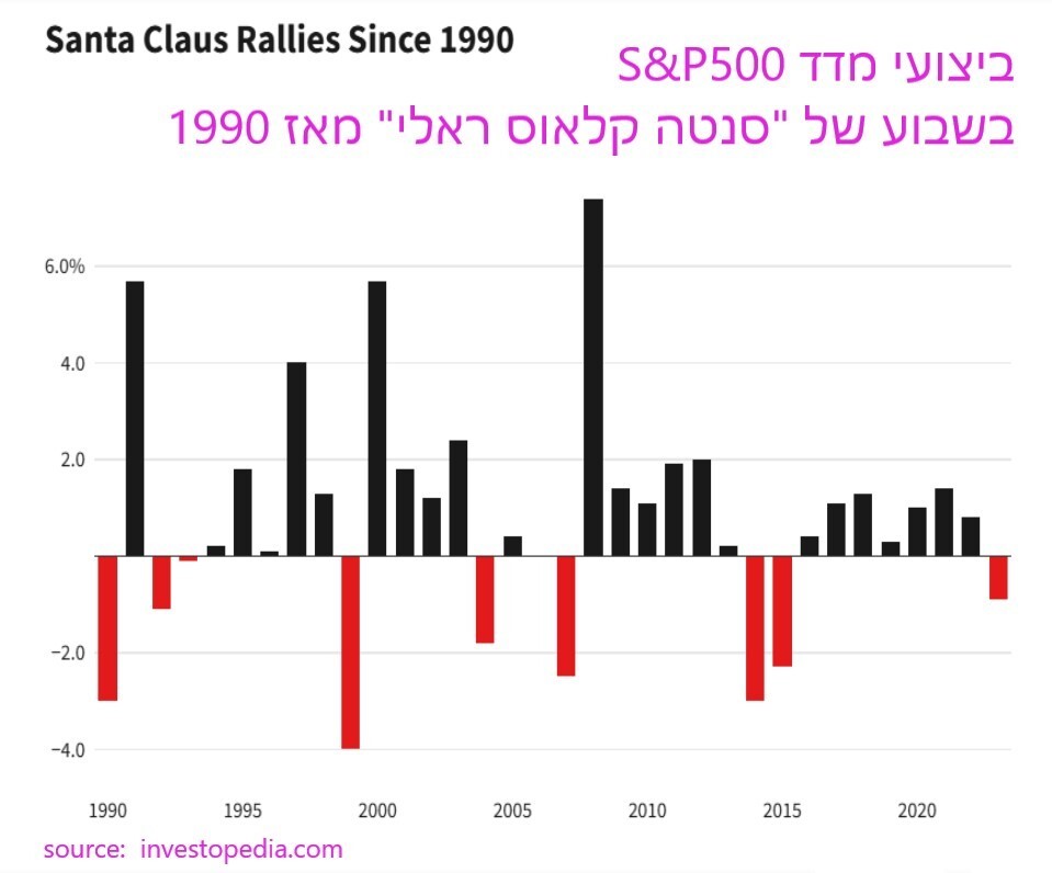 הגרף המצורף כאן מתאר את ביצועי מדד S&P500 במהלך "סנטה קלאוס ראלי" מאז 1990. במבט ראשון נראה שברוב השנים המדד אכן נוטה לעלות בתקופה הזו, אבל ישנן גם לא מעט שנים שבהן הוא דווקא ירד.