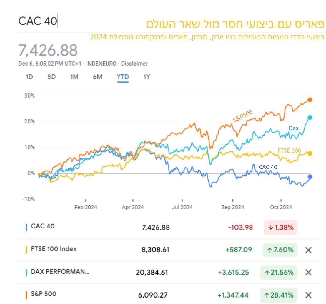 שוק המניות הפריסאי נמצא גם הוא בפיגור משמעותי מול אחיו בלונדון, פרנקפורט וניו יורק. מדד קאק 40 של בורסת פאריס, למרות העלייה בשבוע שעבר, ירד מתחילת השנה בכ-2%. זאת בשעה שמדד S&P500 זינק מתחילת השנה בכ-28%, ומדד דאקס – רשם טיפוס נאה של כ-22%. העליה של מדד דאקס מתרחשת למרות שגם בגרמניה מתחוללות תמורות פוליטיות לא מעטות, שכללו בין השאר את פיטורי שר האוצר והתפוררות "קואליציית הרמזור" של הקנצלר, אולף שולץ.