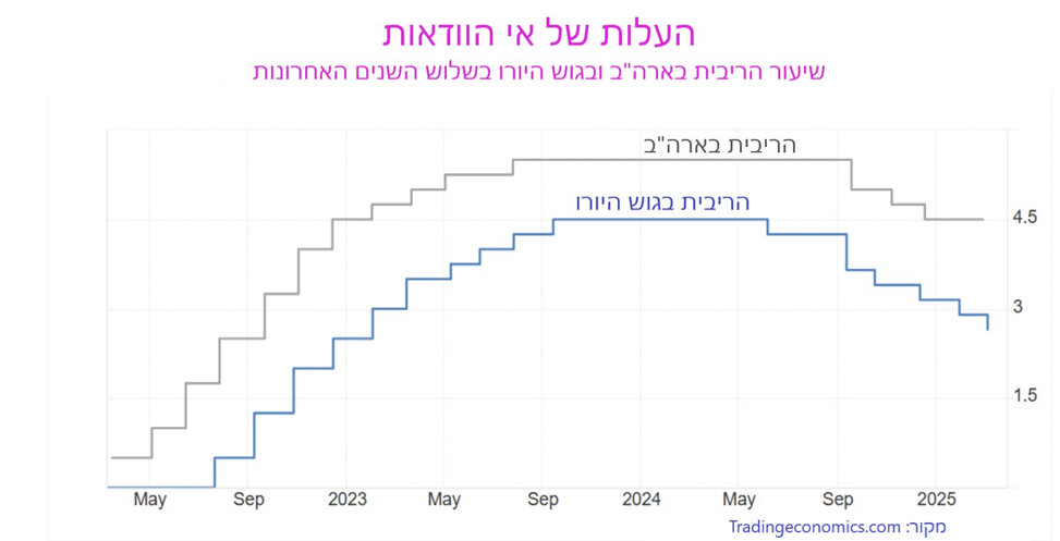 בארה"ב, לשם השוואה, בוצעו בסבב הנוכחי שהחל בספטמבר האחרון רק 3 הפחתות ריבית. הריבית בארה"ב ירדה מרמה של 5.5% ל-4.5% ונראה שהיא תישאר שם בחודשים הקרובים.