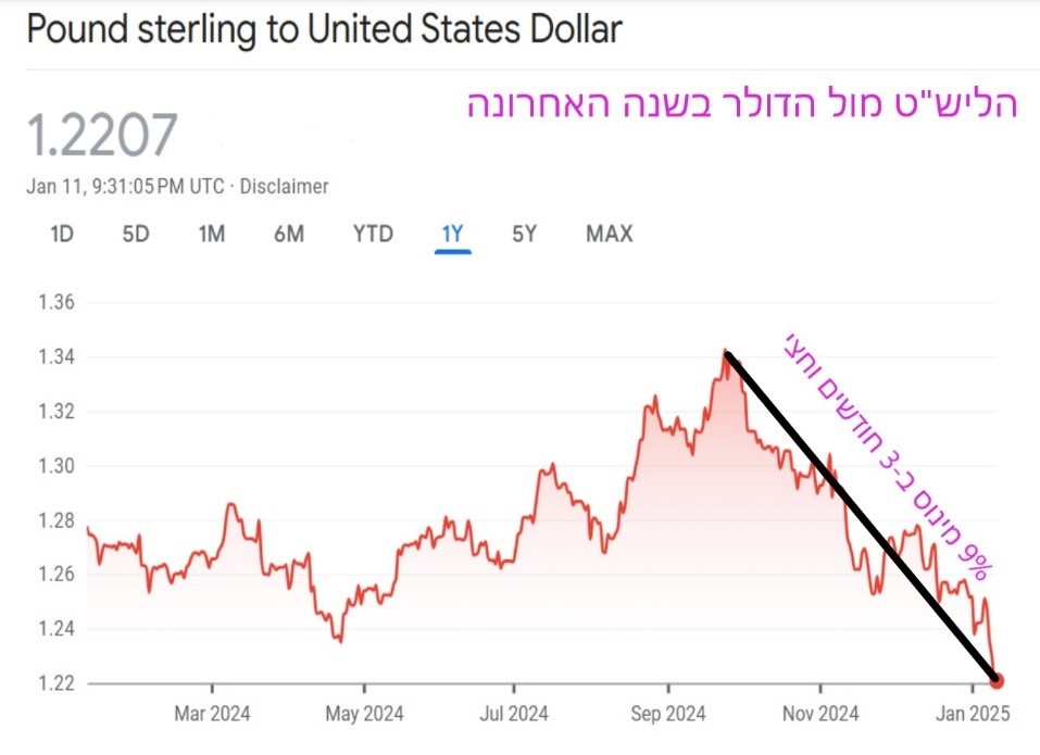 לחשש הזה יש מחיר, הן בחולשת המטבע והן בעליית תשואות האג"ח של ממשלת בריטניה. התשואה לפדיון על האג"ח הממשלתיות של בריטניה ל-30 שנה זינקה בשבוע שעבר לרמה של 5.41% – שהיא הגבוהה ביותר שנראתה באי הבריטי מאז 1998. האג"ח של ממשלת בריטניה ל-10 שנים נסחרות כעת בתשואה של 4.84% – שהיא הגבוהה ביותר מאז המשבר הפיננסי של 2008. ריבית בנק אוף אינגלנד שהופחתה בחצי אחוז מאז יולי האחרון עומדת כעת על 4.75%.
