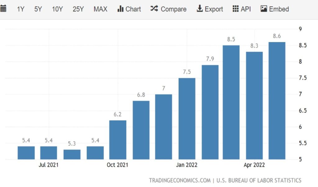עיקר הנפילה שהתרחשה השבוע נרשמה ביום שישי, עם פרסום מדד המחירים לצרכן בארה"ב שגילה כי האינפלציה ב-12 החודשים שהסתיימו במאי עמדה על 8.6%. מדובר בקצב אינפלציה הגבוה ביותר מאז 1981. זהו קצב גבוה מזה שנרשם במארס (8.5%) ואפריל (8.3%).
