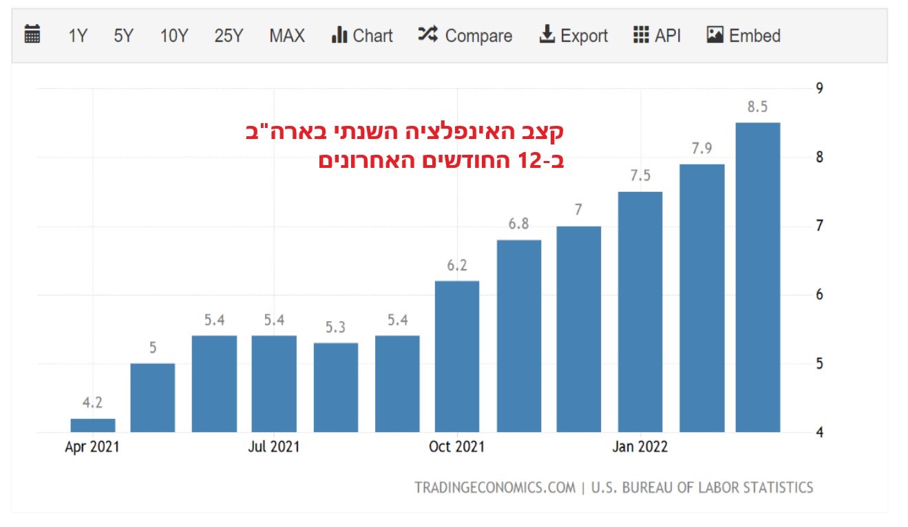 בשבוע שעבר התפרסם מדד חודש מארס בארה"ב שלימד כי האינפלציה מתבססת ברמות גבוהות. המדד הצביע על עליה שנתית של 8.5% בסל הצריכה המשפחתי בארה"ב. זוהי עליית מדרגה נוספת באינפלציה בארה"ב אחרי מדדי פברואר וינואר שהצביעו על עליות של 7.9% ו-7.5% בהתאמה.