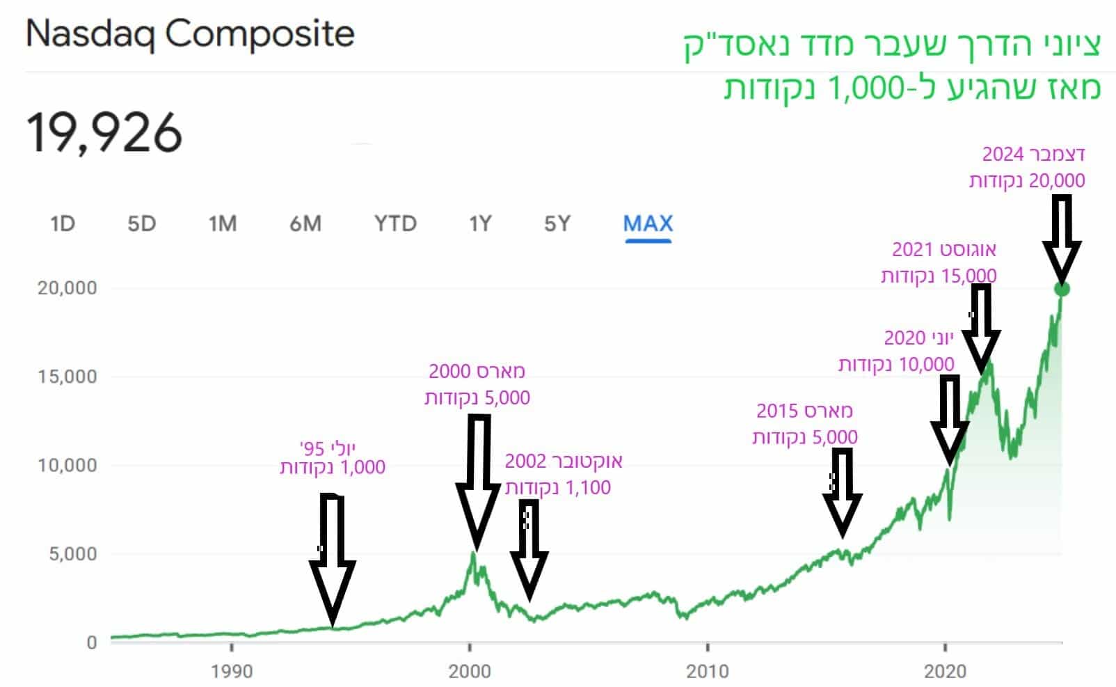ביוני 2020, בעיצומה של מגפת הקורונה, הגיע מדד נאסד"ק לרמה של 10,000 נקודות. נדרשו לו 25 שנים כדי להכפיל שוב את ערכו פי 10 (בין 95' ל-2020). קצב העליה של מדד נאסד"ק ב-49 השנים הראשונות שבהן זינק ערכו פי 100 (מ-100 נקודות ל-10,000) עומד על ממוצע שנתי של כ-9.8% בשנה.