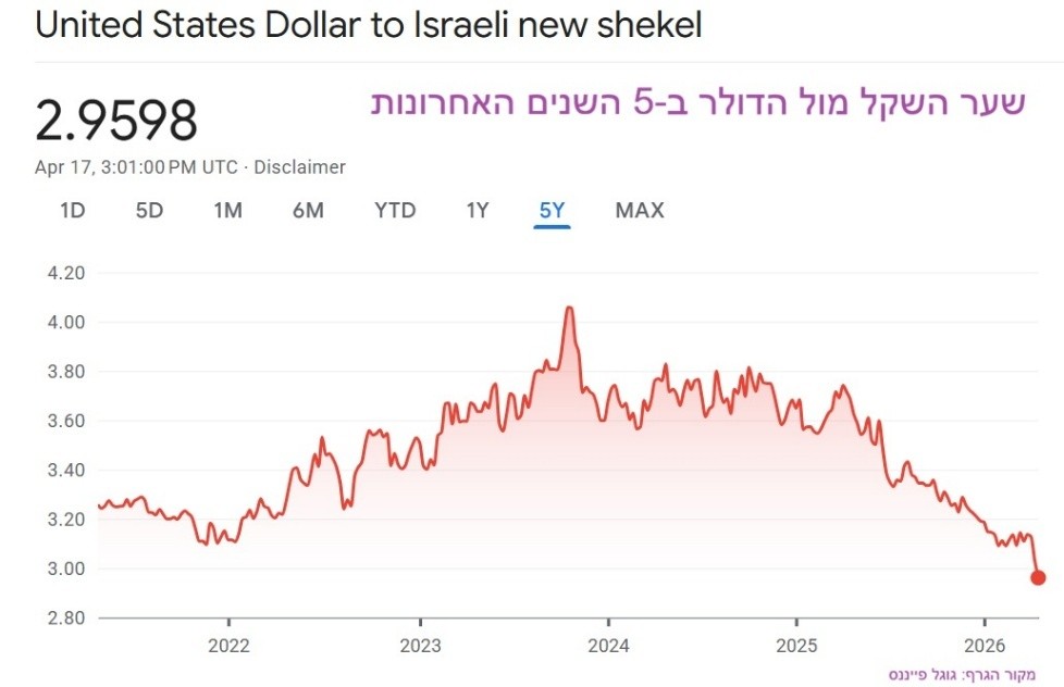 התמתנות האינפלציה, הפסקת האש באיראן ובלבנון, המשך ההטיה השקלית בתיקי ההשקעות והמגמה בעולם סיפקו עוד דחיפה לשקל הישראלי ושערו ירד במהלך השבוע לראשונה זה 31 שנים מתחת לרמה של 3 שקלים לדולר. באפריל 25' עוד נסחר השקל סביב 3.70 שקל דולר. מאז הוא התחזק מול המטבע האמריקאי בכ-20% וחזר לרמות שבהן נסחר באמצע שנות ה-90'.