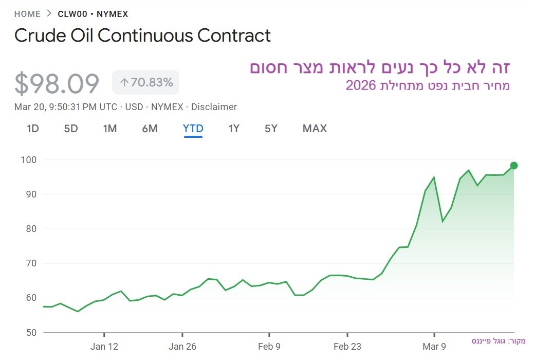 שלושה שבועות לתוך מבצע "שאגת הארי/זעם אפי", ונראה שהדבר העיקרי שעליו כולם מדברים במדינות המערב הוא "נפט". משבר הנפט הנוכחי נובע בעיקר בעקבות סגירת מצרי הורמוז לתנועת מיכליות. חוסר תנועה במעבר שדרכו עוברת כ-20% מהתצרוכת העולמית של נפט גולמי גורמת בהדרגה למחסור. החשש שהמלחמה תתארך והמחסור יגבר כבר הזניקו את מחיר הנפט בכ-70% מתחילת השנה לרמה של כמעט 100 דולר לחבית.