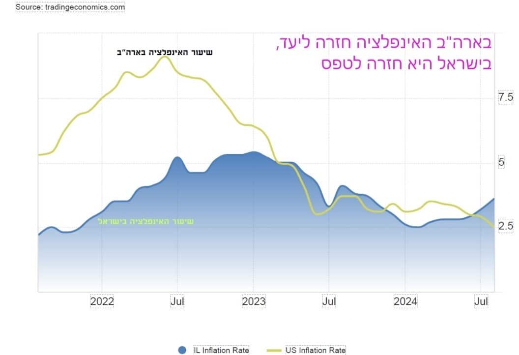 בניגוד לארה"ב, שבה האינפלציה נמצאת בדרך הבטוחה ליעד הרב שנתי – 2% בשנה – בישראל נראה שקצב האינפלציה דווקא חזר לעלות. מדד המחירים לצרכן זינק באוגוסט ב-0.9% לעומת יולי. התחזיות המוקדמות דיברו על עלייה של כ-0.5%, שגם היא לא נמוכה. מדד אוגוסט מציב את קצב האינפלציה בישראל ב-12 החודשים האחרונים על 3.6%. הסעיפים הבולטים שעלו בחודש האחרון היו פירות וירקות (13%), מחירי התחבורה (2.8%) ודיור (0.6%). במהלך 2025 אמור לעלות גם שיעור המע"מ ב-1% (ל-18%), דבר שעלול לגרור לחצי מחירים נוספים.