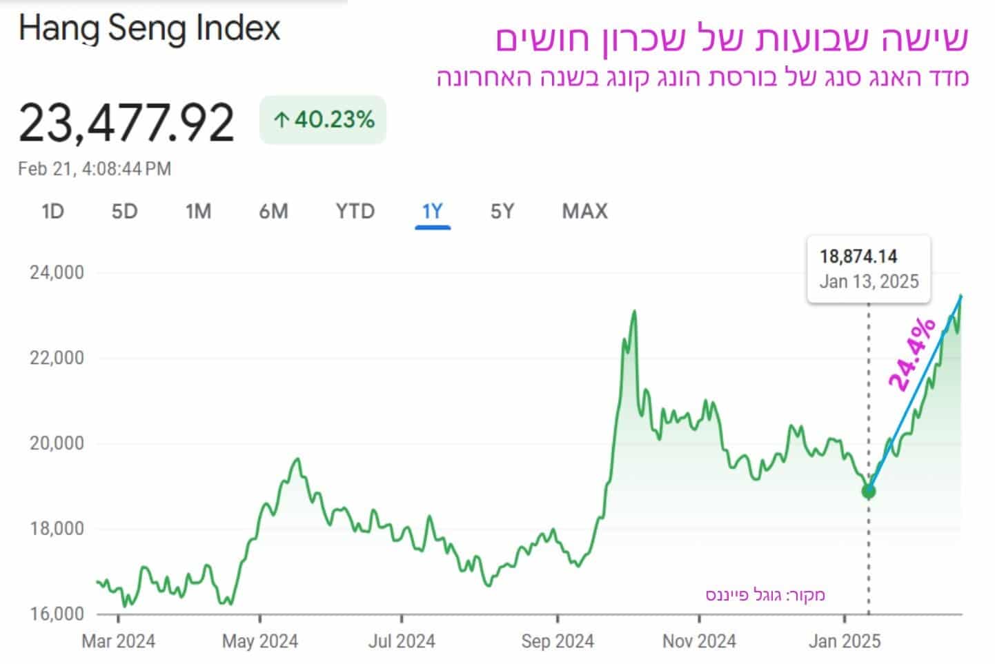הבורסות של שנגחאי והונג קונג החלו את השנה האזרחית בצליעה מסויימת. אבל בחודש וחצי האחרונים נדמה שהמגמה בהן השתנתה. במיוחד אמורים הדברים במדד האנג סנג של בורסת הונג קונג שזינק בשבוע האחרון בכ-4% והשלים קפיצה של כ-24% מאז אמצע ינואר. האנג סנג נמצא כעת בשיא של שלוש שנים.