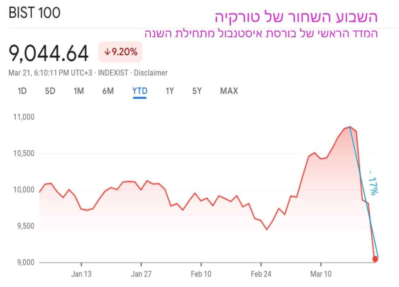 מלבד הנפילה בבורסה גם הלירה הטורקית נפלה בשבוע שעבר בכ-8% מול הדולר. הלירה הטורקית נסחרת כיום ברמה של 38 לירות לדולר. במארס 2020, רק לפני 5 שנים, עוד ניתן היה לקנות דולר אחד תמורת כ-7 לירות טורקיות. מאז התרסק המטבע הטורקי ביותר מ-80%. טורקיה גם סובלת מהיפר-אינפלציה שהגיעה בשיאה לפני כשנה לקצב של כ-70% בשנה. כעת היא נעה סביב קצב של 40% לשנה.