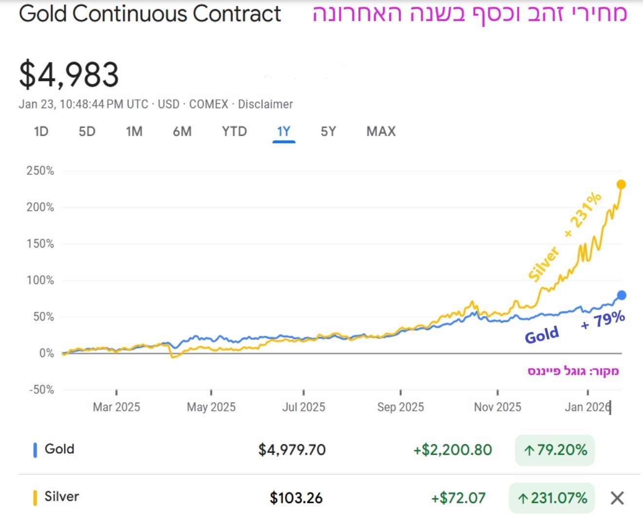 הזהב התקרב לראשונה ל-5,000 דולר לאונקיה. הכסף נסחר מעל 100 דולר לאונקיה. צפירת ההרגעה של טראמפ בכנס דאבוס אפשרה לשווקים לתקן חלק מהירידות של תחילת השבוע. בשבוע הקרוב יתפרסמו הדו"חות הכספיים של 4 חברות מקבוצת "7 המופלאות". מדד בווספה הברזילי זינק ב-8%