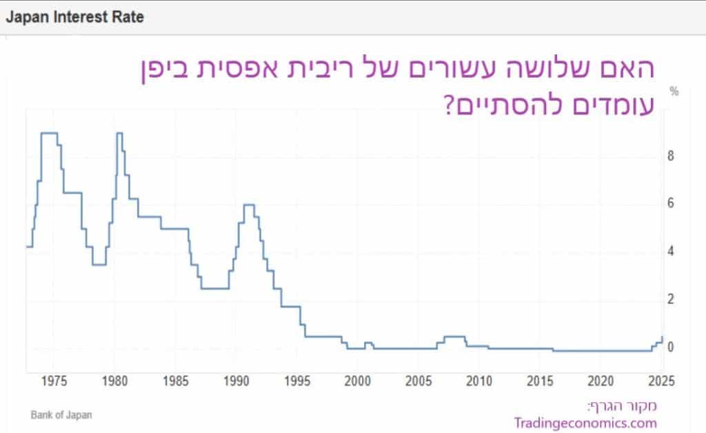 ביום ו' האחרון העלה הבנק המרכזי של יפן (BOJ) את הריבית במדינה ברבע אחוז לרמה של 0.5%. מדובר בהעלאה שלישית במחזור הנוכחי שהחל במרץ 2024. הרמה אליה הגיעה הריבית ביפן היא הגבוהה ביותר מאז 2008 כלומר מזה 17 שנים.
