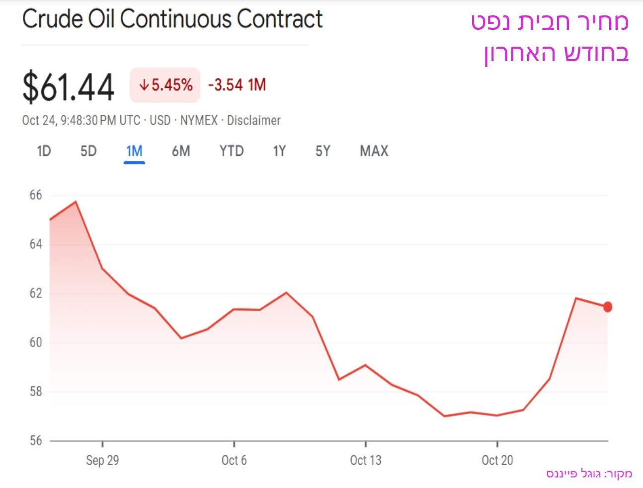 בשבוע שעבר הורה טראמפ להטיל סנקציות על שתי חברות הנפט הגדולות ברוסיה – רוזנפט ולוקאויל. השתיים אחראיות יחד על יותר מ-5% מתפוקת הנפט העולמית. המהלך גרם לקפיצה שבועית של כ-7% במחיר חבית נפט. בסוף השבוע נסחר הנפט סביב רמה של 61.5 דולר לחבית.