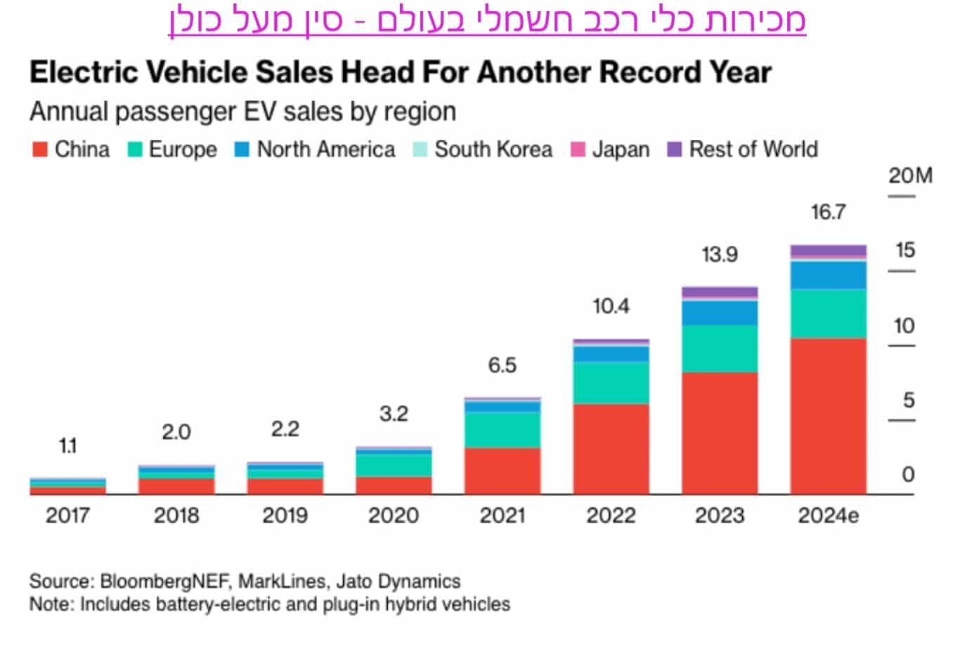מנתונים שפרסמה בנובמבר סוכנות הידיעות בלומברג (ר' גרף מצורף) עולה שמכירות הרכב החשמלי בסין מייצגות כשני שליש מכלל מכירות הרכב החשמלי בעולם. אילון מאסק, מנכ"ל חברת טסלה האמריקאית, הוא אולי האיש העשיר בעולם כיום, אבל החברה שלו נמצאת במרוץ צמוד מול כמה יצרניות סיניות מובילות. ייתכן שזו עוד אחת מהסיבות שדחפו אותו לכיוונו של הנשיא הנכנס. מדיניות המכסים שמתכנן טראמפ על יבוא היא אחד הקטליזטורים העיקריים שהזניקו באחרונה את מנייתה של טסלה, ואיתה גם את עושרו האישי של מאסק.