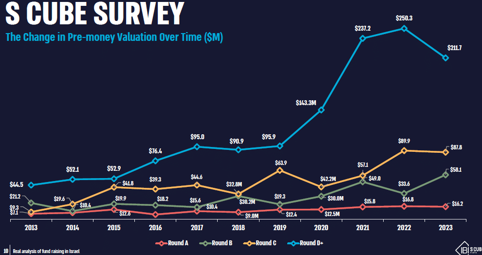 על פי המחקר, אשר מבוסס על נתוני אמת מאלפי הערכות שווי שביצעה S Cube ללקוחותיה החל משנת 2013, האירועים הגיאופוליטיים במשק הישראלי ואווירת המשבר שליוותה את סקטור הטכנולוגיה העולמי בשנה החולפת התבטאו בירידה משמעותית במספר סבבי הגיוס, כאשר בסבבי הגיוס שכן יצאו לפועל נרשמה ירידה של כ-15% בשווי החציוני שקיבלו החברות בסבבי הגיוס המתקדמים (D ומעלה) ביחס לאשתקד וירידה קלה של כ-2% בשווי החציוני שקיבלו החברות בסבבי C. בסבבי הגיוס של החברות בשלבי הגיוס הראשוניים נרשמה מגמה מעורבת, עם זינוק של כ-73% בשווי החציוני שקיבלו החברות בסבבי הגיוס B, ואילו בסבבי הגיוס הראשוניים נרשמה ירידה קלה של כ-4% בשווי שהוענק לחברות. לנוכח ירידה של כ-40% במספר סבבי הגיוס B, ככל הנראה עליית השווי נובעת מבחירה סלקטיבית מאוד של המשקיעים בחברות שצלחו את שלבי הפיתוח הראשוניים והראו פוטנציאל השאת ערך משמעותי.
