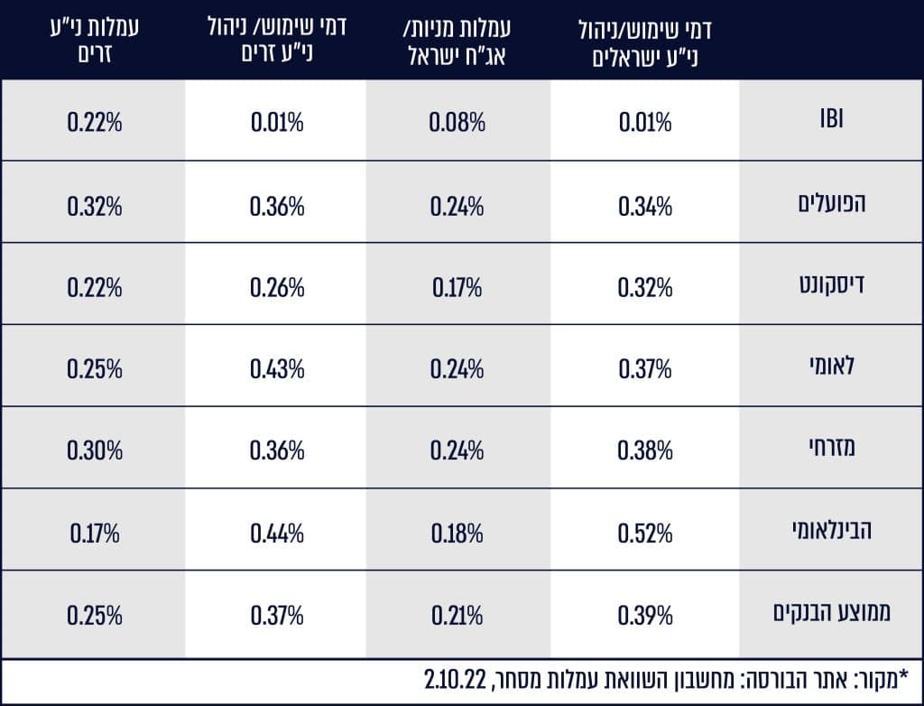 בתרגום למספרים (בהסתמך על נתוני מחשבון השוואת העמלות של הבורסה), בארבעת הבנקים הגדולים בישראל תעריפוני עמלות מכירה וקנייה של מניות ואג"ח בשוק המקומי נעים בין 0.4% לכ-0.5% משווי העסקה, לצד עמלת מינימום של 20-45 ש"ח לעסקה (ראו טבלת מצורפת). לעמלות אלה נלווים גם דמי ניהול שנתיים של עד 0.5%, דמי משמרות רבעוניים, עמלת אי-ביצוע ומפרט עלויות יקרות נוספות ביחס ליתר הפעולות בחשבון (המרת מט"ח ועוד).